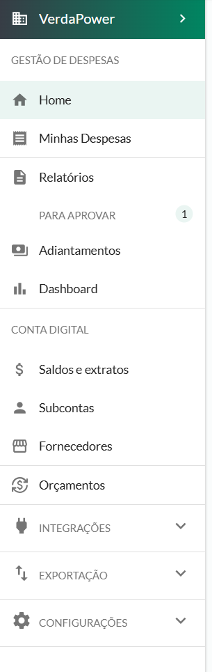 Agora, você encontrará as seções de Gestão de Despesas e Usuários em um novo menu lateral expandido, que pode ser acessado rapidamente a partir do ícone superior esquerdo da tela.